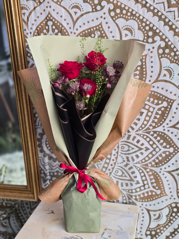 Three stunning roses speak love's spell, entwined with Astrantia 'star of devotion' all woven together as a symbol of fierce-hearted love.